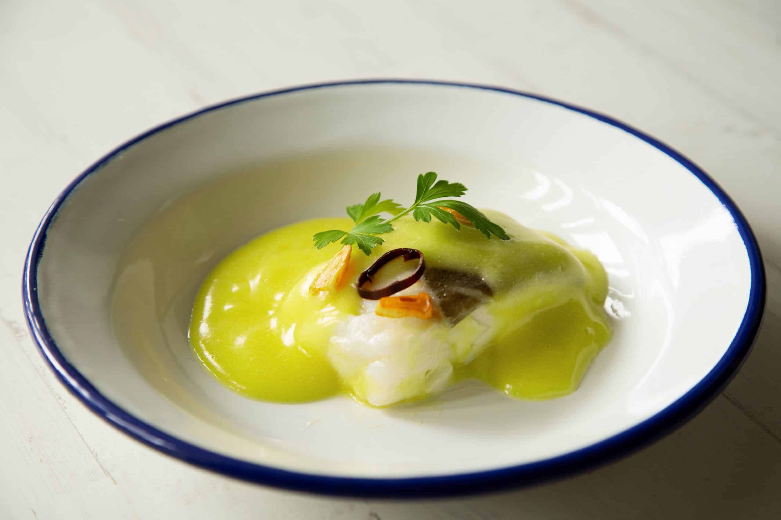 3. Cuando el bacalao esté tierno y la salsa haya emulsionado completamente, retira la sartén del fuego.